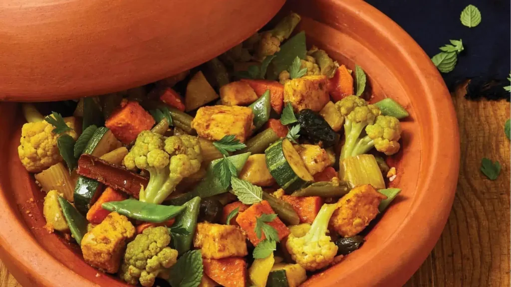 - Tagine: Hidangan khas Maroko yang dimasak dalam wadah tanah liat, terdiri dari daging, sayuran, dan rempah-rempah.
